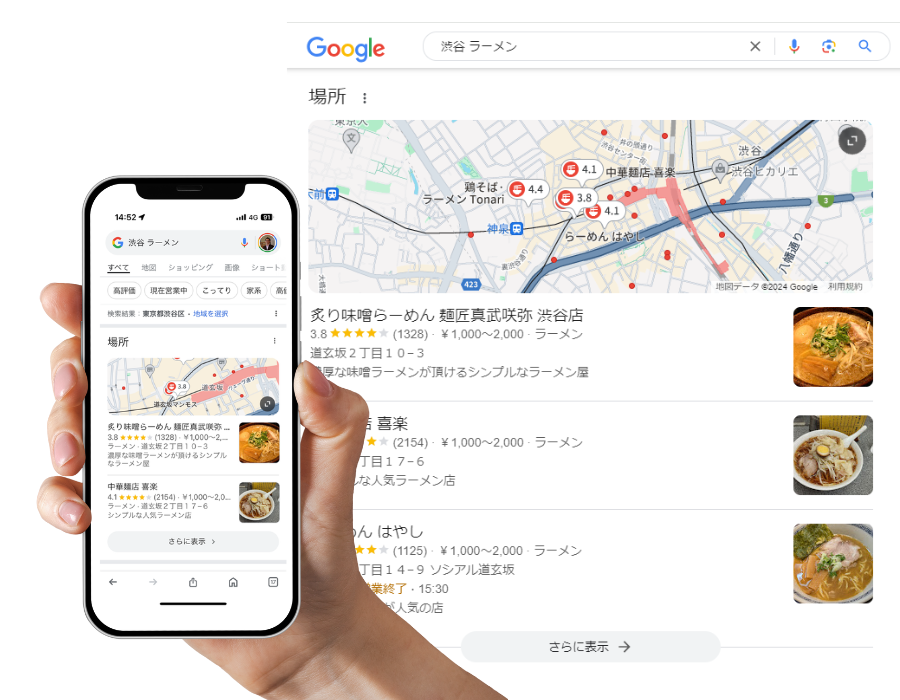 Googleで「渋谷 ラーメン」のように、地名とお店の種類で検索したときに表示される地図を見たことはありますか? MEO対策をすると、この地図の中で、あなたのお店を上位に表示させることができます。